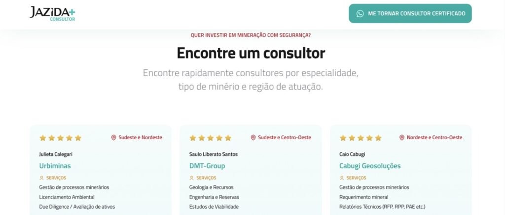 O marketplace leva o nome de Jazida + Consultor, uma iniciativa do Jazida criada para integrar consultores certificados às principais demandas do setor mineral no Brasil. A plataforma foi desenvolvida para otimizar a conexão entre mineradores e profissionais com experiência comprovada, facilitando o acesso a serviços técnicos em diferentes fases do processo minerário.