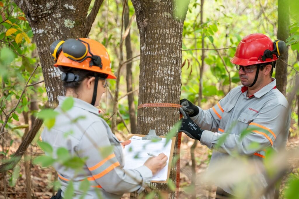 Equipe técnica realiza medição de árvores durante catálogo florestal. Imagem: Lundin Mining / Divulgação