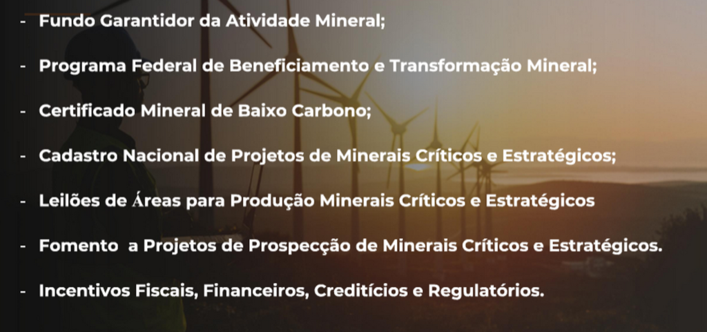 Entre os principais pontos estão: incentivo à pesquisa mineral, com estímulo às junior companies; criação de um fundo garantidor para a atividade mineral; políticas de beneficiamento e transformação para agregação de valor.