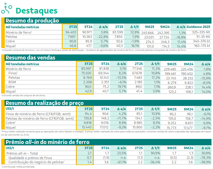 A empresa também informou que o segundo forno de Onça Puma entrou em operação, abrindo caminho para a expansão da produção nos próximos trimestres. Segundo o relatório, os três negócios da mineradora — minério de ferro, cobre e níquel — seguem dentro do limite superior das metas de produção previstas para 2025.